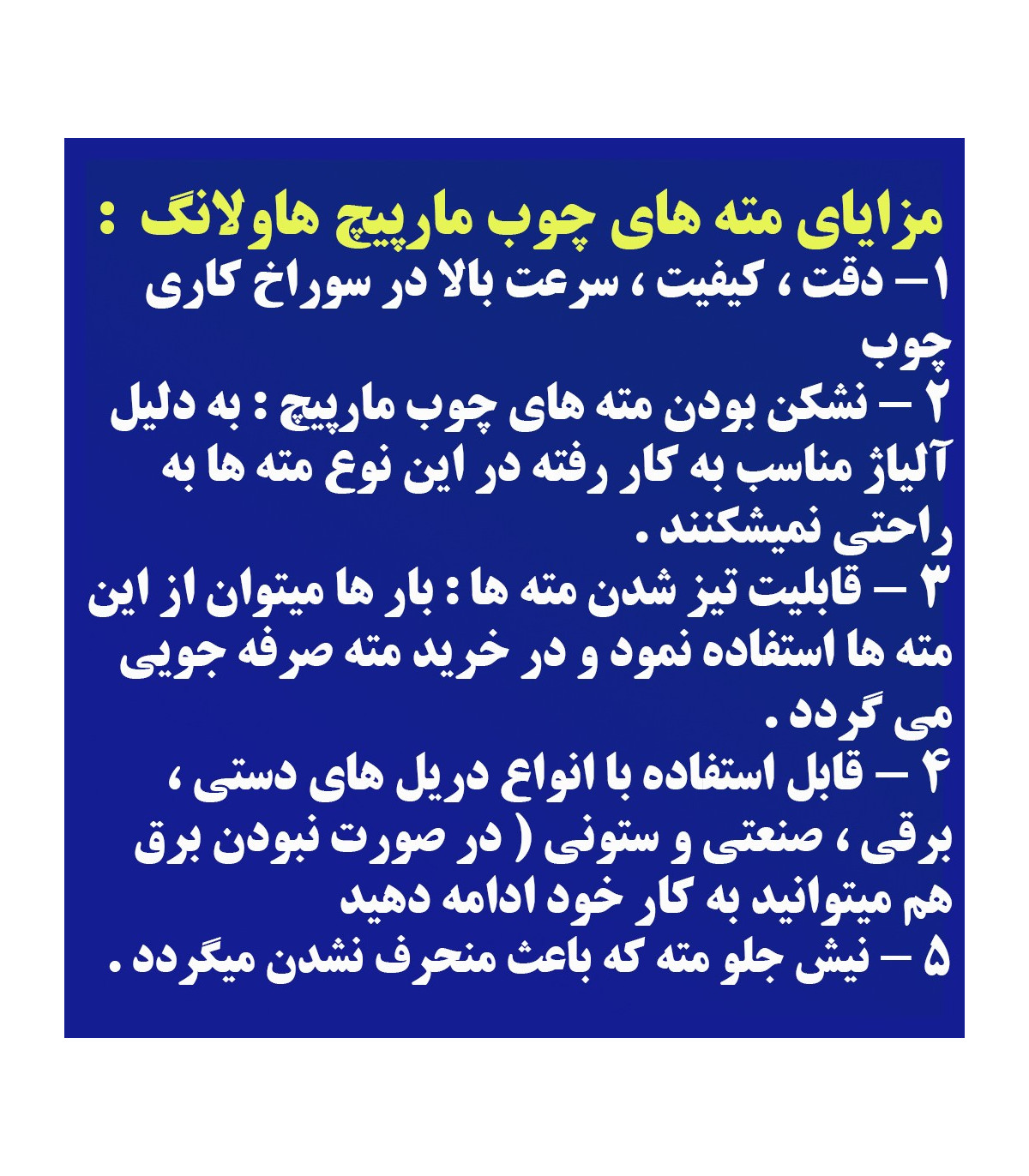 | کاربرد : سوراخ کردن چوب و انتقال مواد صنعتی (ماردون) |